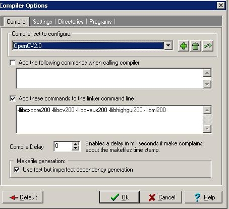 • Sebagai review, perubahan dari default adalah dengan membuat nama compiler baru dan menyertakan linker (-llibcxcore200 -llibcv200 -llibcvaux200 -llibhighgui200 -llibml200) ke dalam tab Compiler.