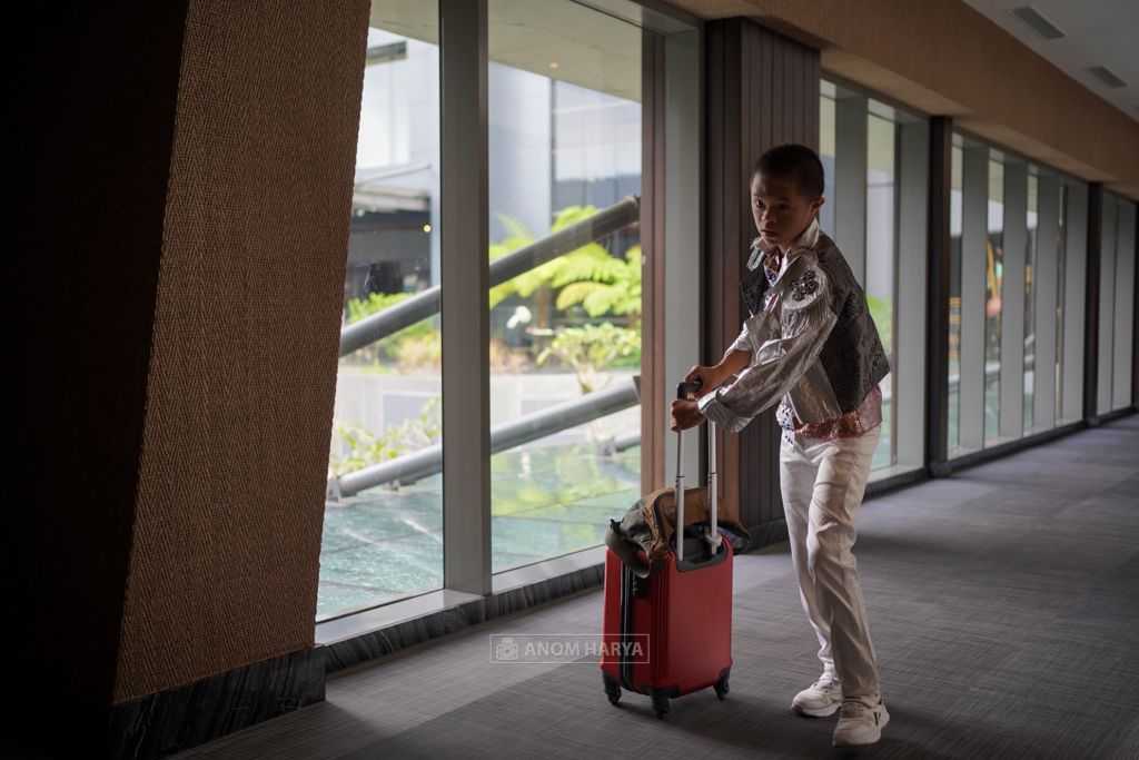 Ada Faza yang kulihat membawa kopernya kemana-mana. Kostum dan gerakannya menarik perhatianku. Saat lewat di depanku, kucoba untuk mengarahkannya. Ternyata Faza bisa diarahkan lho. Dia bisa bergaya dengan sangat alami. Dia juga mengerti apa aku sudah memotretnya atau belum.