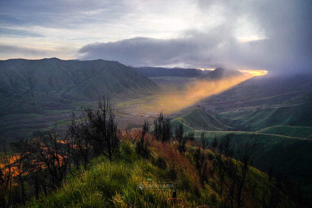 Tebing tempat kami berkemah menghadap ke timur. Tidak perlu jalan jauh, dari sebelah tenda pun bisa motret matahari terbit. Awan rendah yang menutup lautan pasir berhasil ditembus cahaya keemasan. Kami seperti memotret lampu sorot raksasa dari balik Gunung Batok. Terjadi sekitar 5 menit membuat kami bisa pindah ke beberapa tempat dan mencoba beberapa komposisi dalam mengabadikannya.