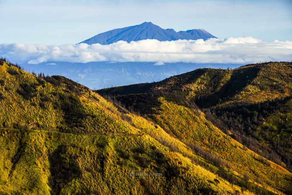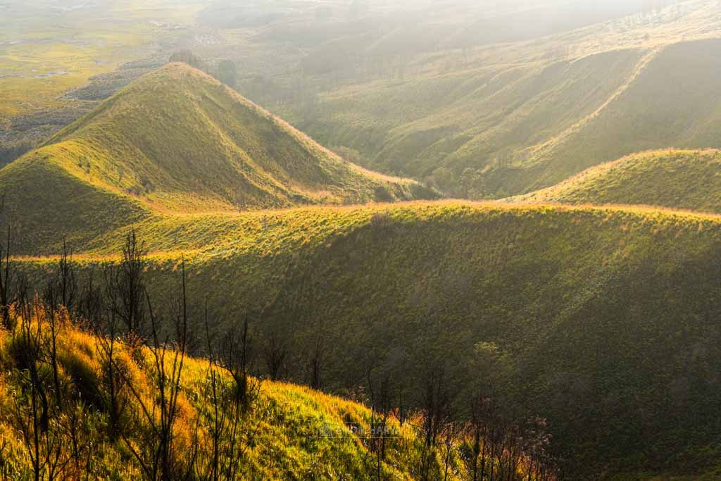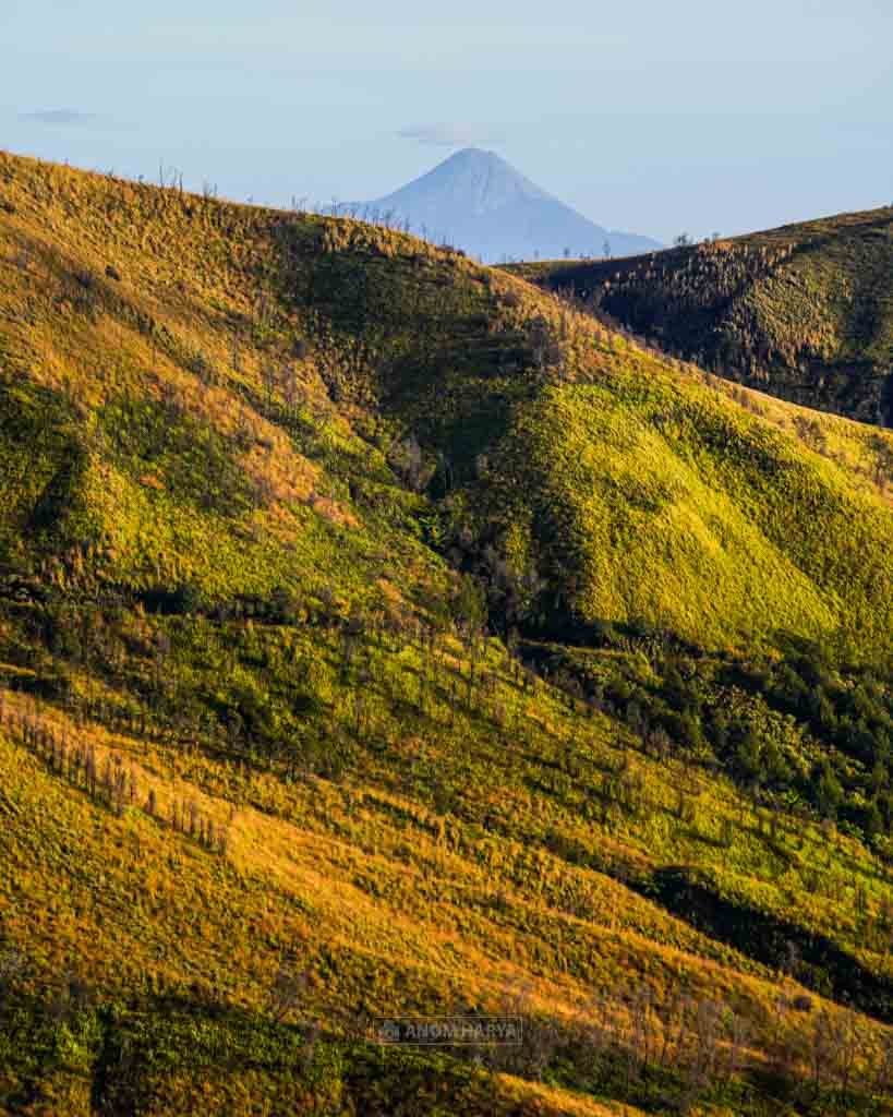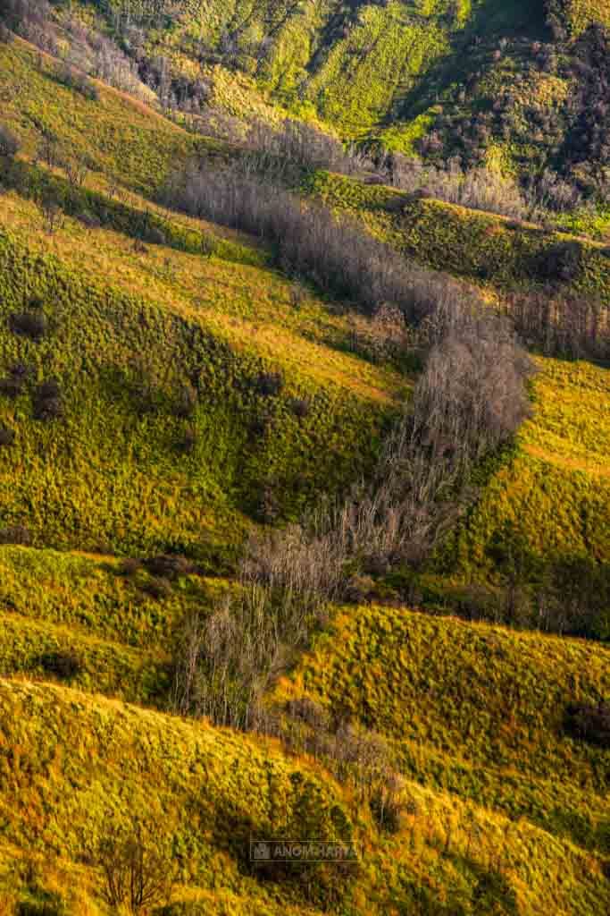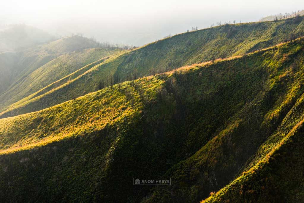 Agar tak kehilangan momen, aku segera naik dan ganti lensa. Dari samping tenda, kuarahkan lensa 70-200mm ke perbukitan di sebelah timur. Backlight membuat kontur perbukitan menjadi lebih terlihat. Garis gelap terangnya menambah suasana dramatis. Ah, aku jadi teringat dengan foto-foto perbukitan di Sumba meski belum pernah menjejakkan kaki disana.